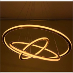 لوستر LED مدرن ، چراغ آویز خلاقانه با سیم ارتفاع قابل تنظیم یک متری، لوستر حلقه ای 150 واتی که در سایز های سی و پنجاه و هفتاد سانتی میباشد که در این طرح دو طرف نور دهی میکند و از پروفیل حالت اچ تولید شده است و بسیار مناسب سالن پذیرایی اتاق غذاخوری اتاق نشیمن اتاق خواب میباشد، ارتفاع از سقف نیز قابل تنظیم میباشد.