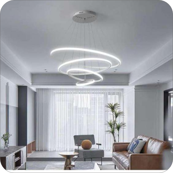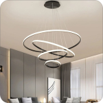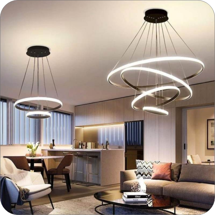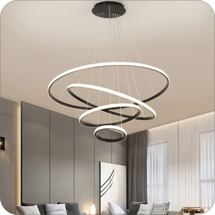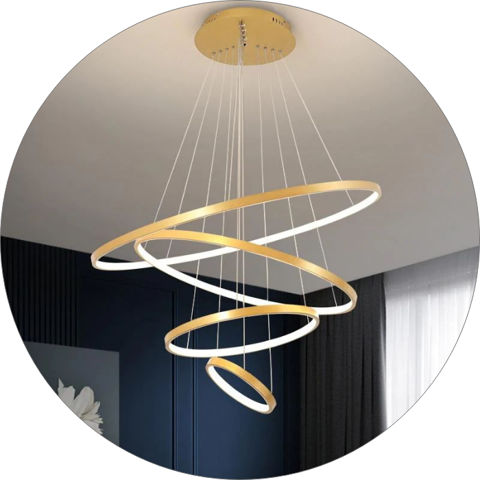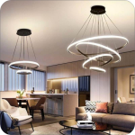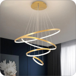 لوستر LED مدرن ، چراغ آویز خلاقانه با سیم ارتفاع قابل تنظیم یک متری،  لوستر حلقه ای 120 واتی که از چهار حلقه سایز های سی و پنجاه و نود سانتی تشکیل شده است و بسیار مناسب سالن پذیرایی اتاق غذاخوری اتاق نشیمن اتاق خواب میباشد،لازم به ذکر است که این سبک لوستر ها را با تغییر حالت آویز شدن به شکل های مختلف تبدیل کنیم و ارتفاع از سقف انها قابل تنظیم میباشد.
