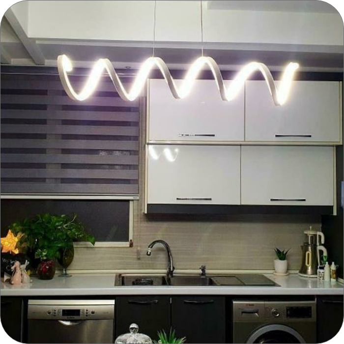 لوستر LED مدرن ، چراغ آویز خلاقانه با سیم ارتفاع قابل تنظیم یک متری، لوسترخطی فنری یک متری 50 واتی که از سه متر پروفیل ناودانی دو در یک گرد شده به قطر 15 سانتی تشکیل شده است و بسیار مناسب انواع میز و کانتر میباشد،لازم به ذکر است که ارتفاع از سقف انها قابل تنظیم میباشد.