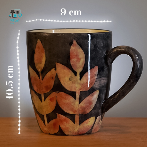 ماگ سرامیکی زیبا و چشم‌نواز که بدنه آن به رنگ مشکی مات است و طرح برگ‌های رنگارنگ پاییزی روی آن نقش بسته است. این طرح زیبا و طبیعی، به ماگ ظاهری گرم و دلنشین بخشیده است.