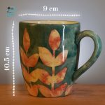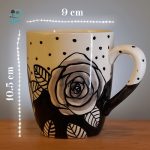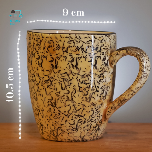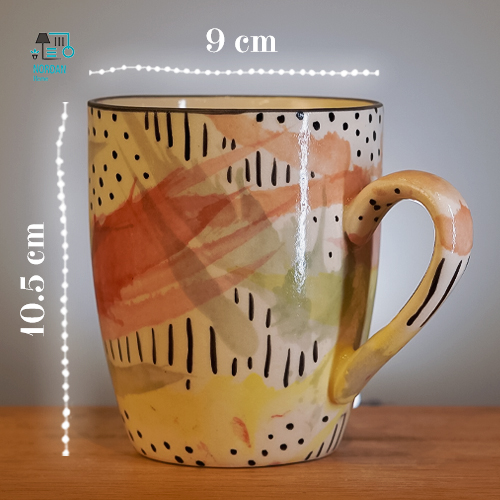 • ابعاد استاندارد: ابعاد ذکر شده در تصویر (ارتفاع 10 سانتی‌متر و قطر دهانه 9 سانتی‌متر) ابعادی استاندارد برای یک ماگ است.