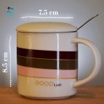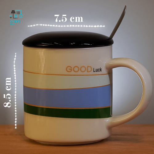 این ماگ دارای بدنه ای به رنگ کرم روشن است که با طرحی راه راه و رنگارنگ تزئین شده است. که به ماگ ظاهری شیک و کلاسیک می بخشد. در قسمت بالای فنجان، عبارت “GOOD LUCK” به رنگ طلایی نوشته شده است که حس خوش شانسی و انرژی مثبت را به همراه دارد. درب ماگ به رنگ مشکی براق است و به خوبی روی دهانه فنجان قرار می گیرد. دسته ماگ نیز به رنگ کرم و همرنگ با بدنه است و دارای طراحی ساده و ارگونومیک است.