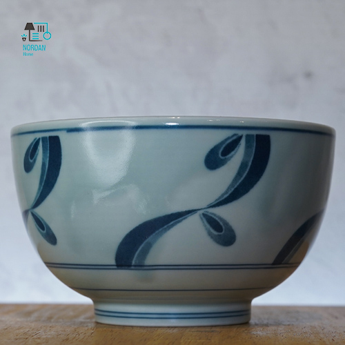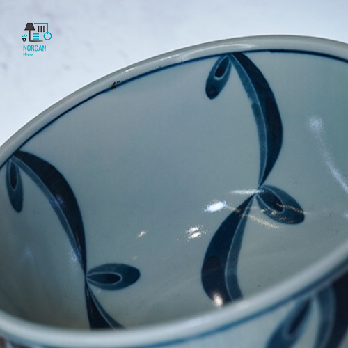 این کاسه سرامیکی با زمینه ای ببه رنگ توسی ملایم و نقش های از طیف هایم مختلف آبی جلوه ای شیک و متفاوت به میز شما می بخشد