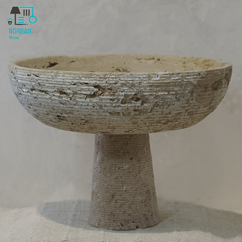 کاسه تراورتن لوکس با طراحی پایهدار و ساخته شده از سنگ طبیعی، یک انتخاب ایدهآل برای سرو غذا و دکوراسیون داخلی شیک است. این کاسه علاوه بر کاربردی بودن، جلوهای لوکس به میز شما میبخشد و میتواند نقطه کانونی زیبایی روی میز ناهارخوری یا فضای داخلی خانه باشد.